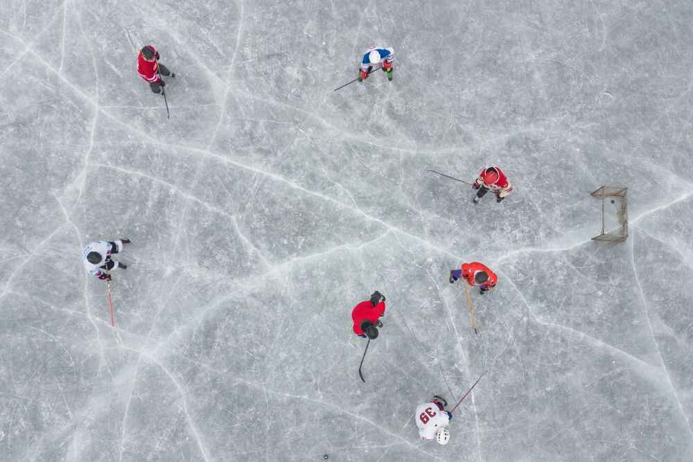 2025年1月7日,冰球爱好者在哈尔滨丁香公园的冰面上打冰球。