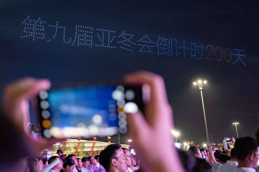 这是2024年7月22日拍摄的第九届亚冬会倒计时200天主题活动现场的无人机表演。