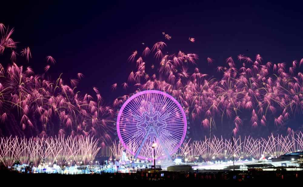 2025年2月7日,焰火在开幕式分会场上空绽放。