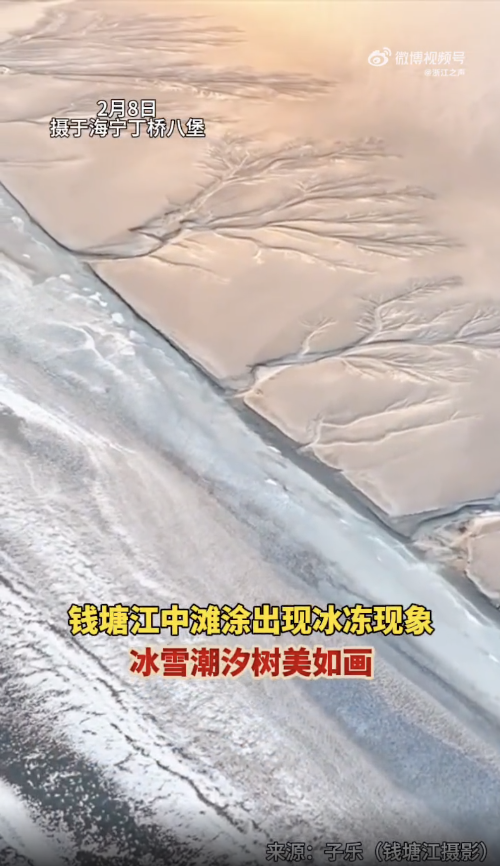 在嘉兴海宁的钱塘江段滩涂处出现了罕见的自然现象——江水结冰,这些冰附在因退潮形成的地貌奇观“潮汐树”上。