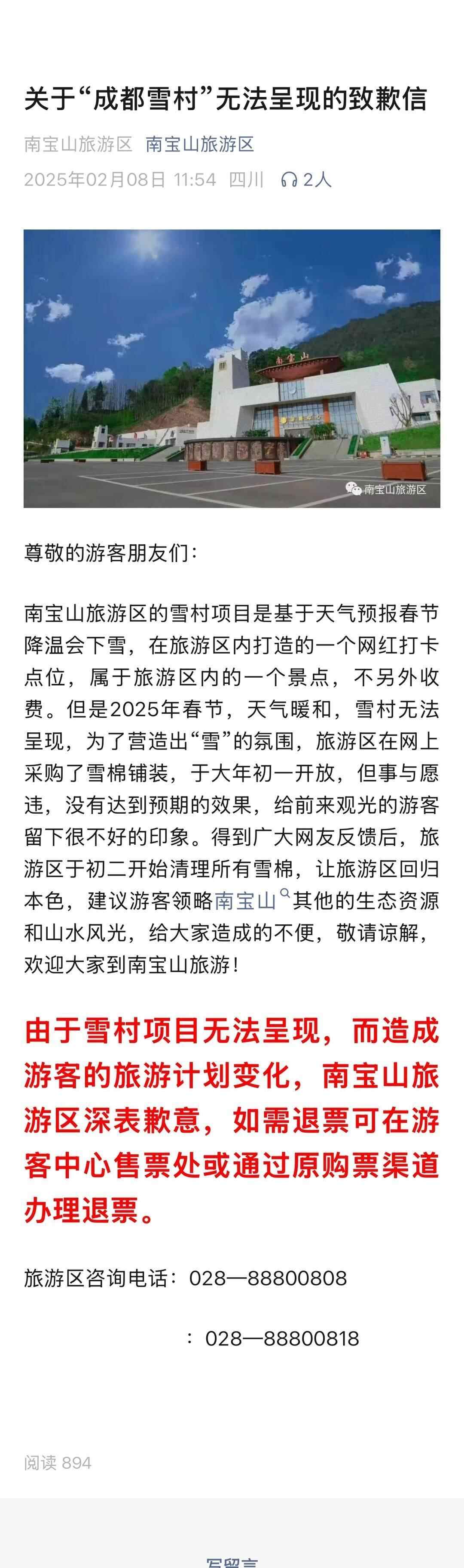 南宝山旅游区的雪村项目是基于天气预报春节降温会下雪,在旅游区内打造的一个网红打卡点位,属于旅游区内的一个景点,不另外收费。但是2025年春节,天气暖和,雪村无法呈现,为了营造出“雪”的氛围,旅游区在网上采购了雪棉铺装,于大年初一开放,但事与愿违,没有达到预期的效果,给前来观光的游客留下很不好的印象。得到广大网友反馈后,旅游区于初二开始清理所有雪棉,让旅游区回归本色,建议游客领略南宝山其他的生态资源和山水风光,给大家造成的不便,敬请谅解,欢迎大家到南宝山旅游!