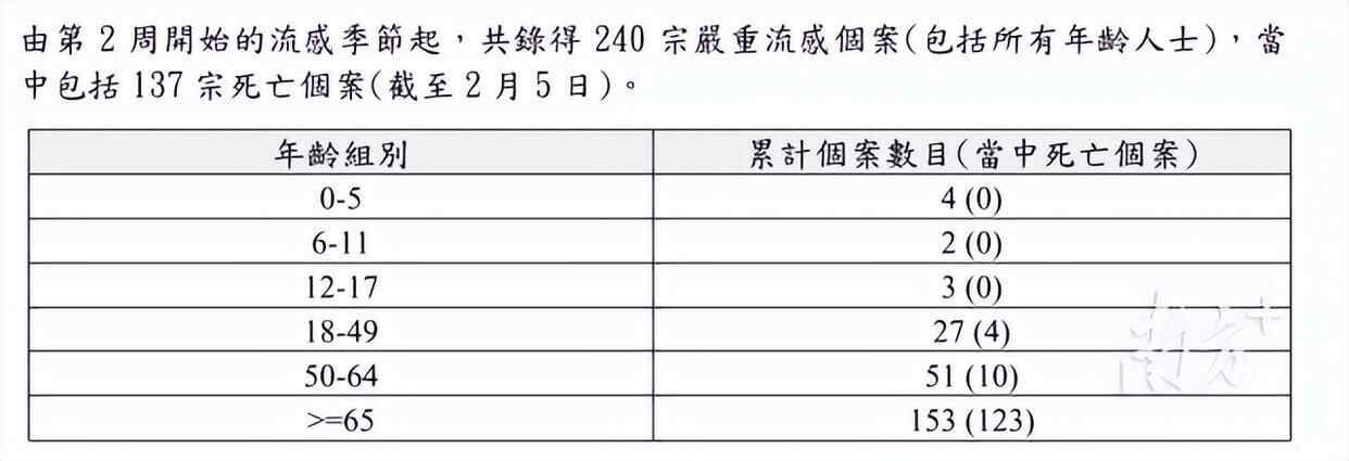 《流感速递》中也提到,1月5日至2月5日,香港累计240宗严重流感个案,包括137宗死亡个案。死亡个案主要集中在老年人,65岁以上占123宗。在已掌握临床资料的成人死亡个案中,大约有81%有慢性疾病。