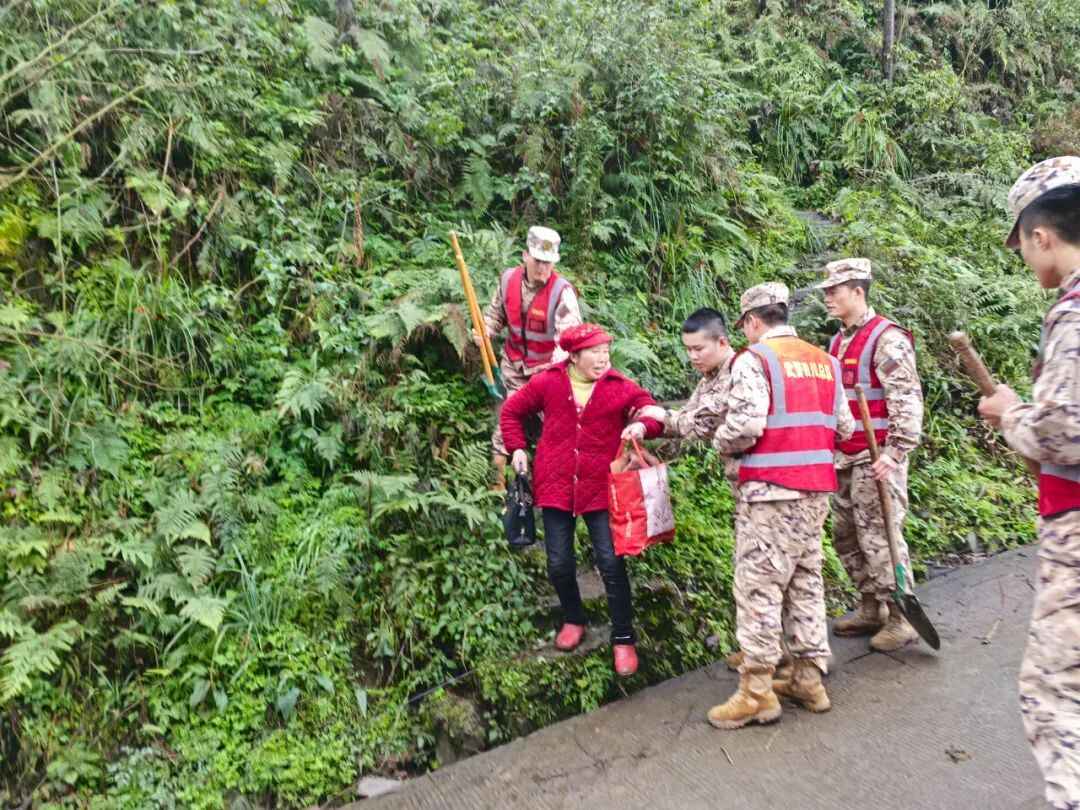 2月8日,武警四川总队宜宾支队官兵在筠连县沐爱镇金坪村转移一名老人
