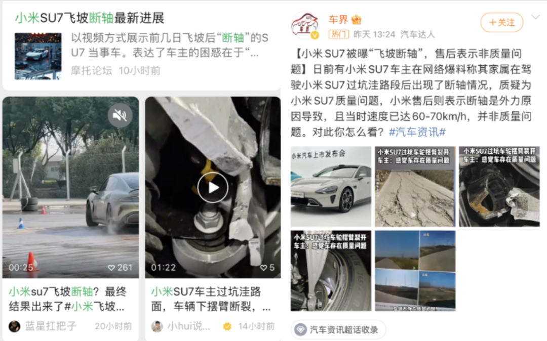 近日,网传有人驾驶小米SU7驶过坑洼路段后出现了断轴情况,引发关注。