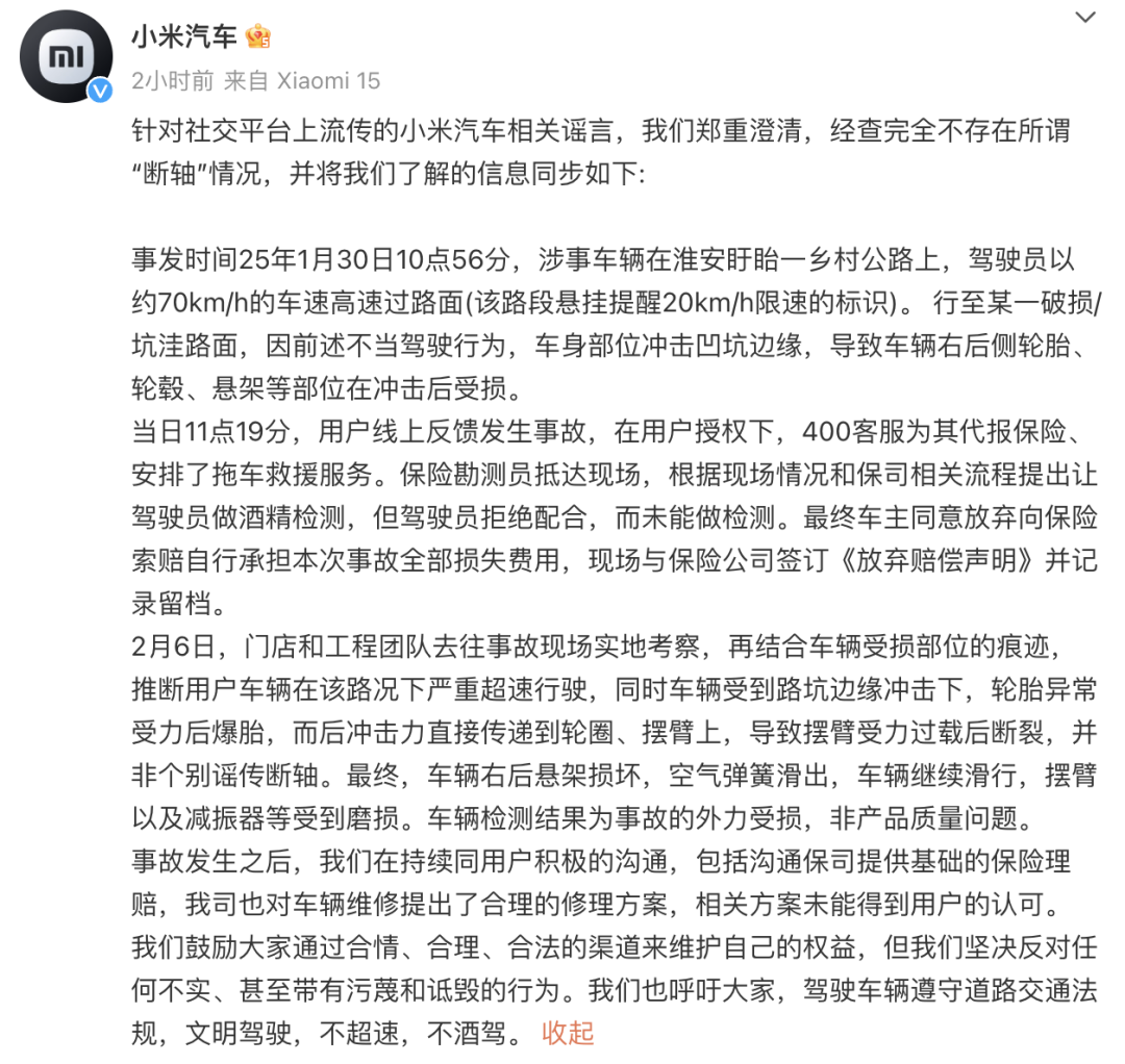 对此,2月9日,小米汽车发文称:“针对社交平台上流传的小米汽车相关谣言,我们郑重澄清,经查完全不存在所谓‘断轴’情况。”