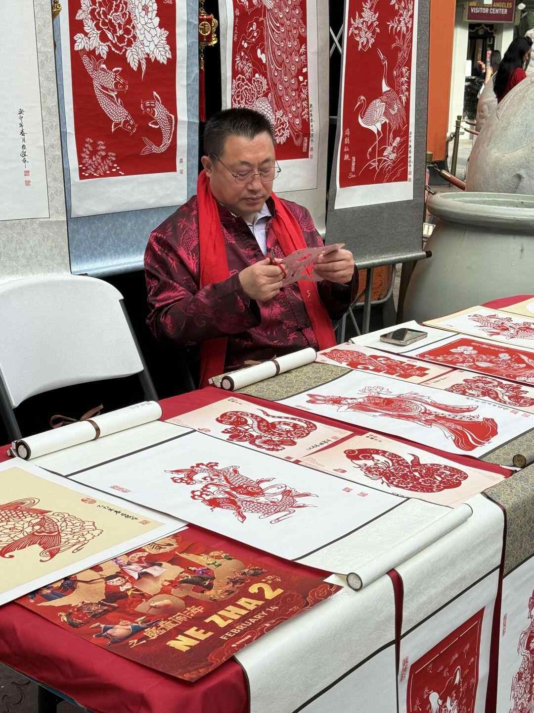 在首映礼现场,星光大道上布置了充满中国年味的装饰,舞龙表演、武术展示等传统文化活动吸引了大量国际友人驻足。活动现场还设置了“非遗集市”,展示了捏泥人、糖画、写春联、剪纸等中国传统技艺,甚至还请来了“财神爷”,吸引了众多国际友人参与体验、拍照打卡。