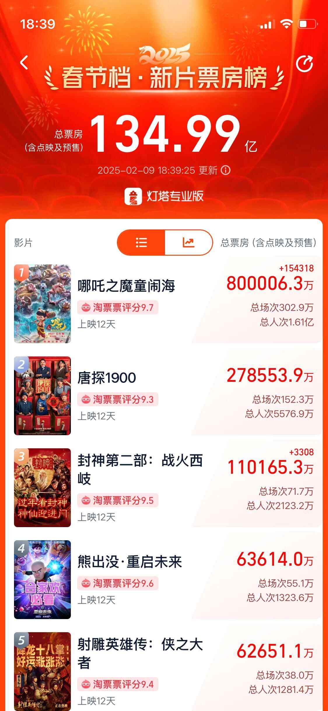 根据灯塔专业版数据,截至2月9日18时39分,《哪吒之魔童闹海》(哪吒2)票房破80亿元,成为中国影史首部票房破80亿电影,暂列全球票房榜第39名,打破80亿元人民币票房俱乐部好莱坞影片垄断,由于影片还未在海外正式上映,该成绩再度刷新单一市场票房冠军纪录!