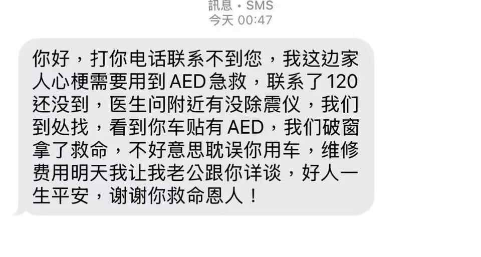 叶先生是龙川客家人,平日在广州番禺工作生活。为了不影响次日工作,叶先生睡觉时习惯手机静音。2月8日上午,叶先生起床后发现手机有十几个未接电话,还收到了一条短信,“我这边家人心梗需要AED急救……看到你车贴有AED,我们破窗拿了救命,不好意思耽误你用车……”