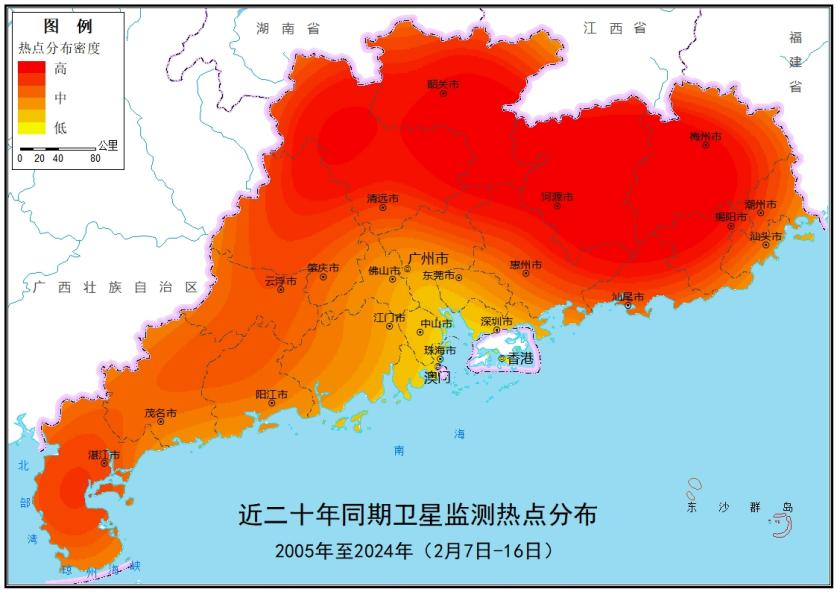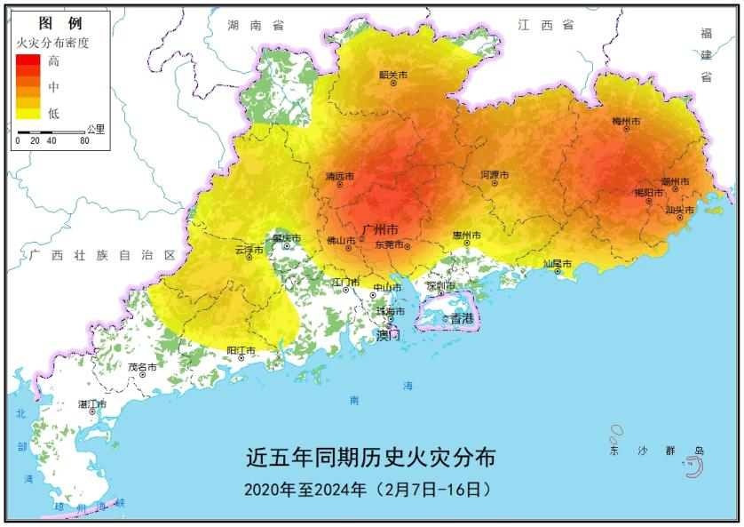 火源情况方面,历史同期火源中,本时段近20年历史同期卫星热点数量同比减少了22%,韶关、河源、梅州、惠州、湛江、茂名、肇庆、清远等地卫星热点较多。本时段近20年卫星热点中,经核实反馈林火占比3%,农事用火占比48%,计划用火占比17%。