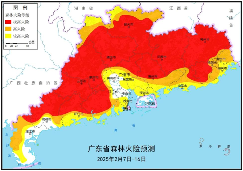 2月9日,广东省应急管理厅发布春节后期森林火险趋势分析报告(2025年2月7日—16日)(以下简称“报告”)。报告综合考虑天气、林情、火源、社情和地势等因素,2月7日—16日广东大部地区的森林火险等级为较高火险(三级);其中粤东大部、粤西中部、珠三角东部和西部的森林火险等级为高火险(四级);粤东西部、粤北大部、粤西北部、珠三角东北部和西部的森林火险等级为极高火险(五级)。