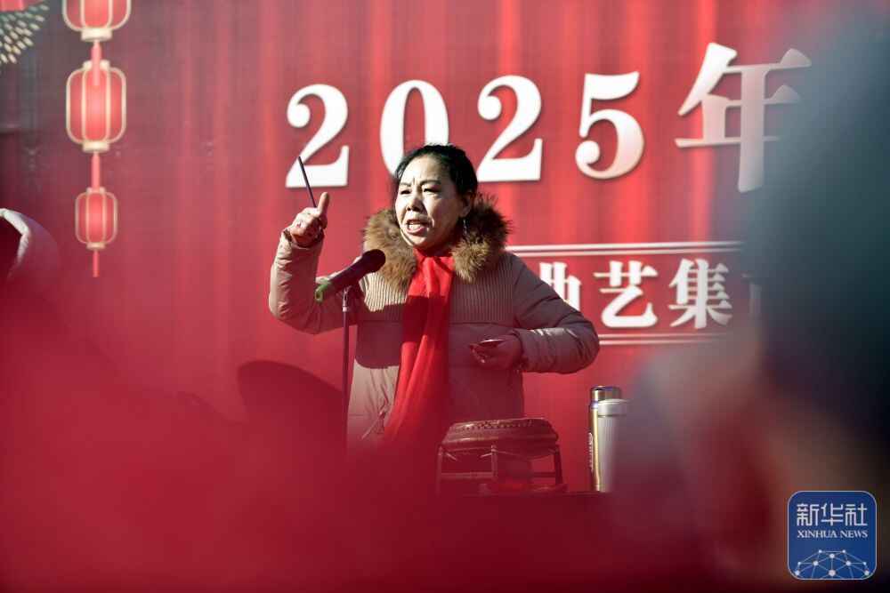 ↑2月9日,河北省保定市的曲艺艺人李志华在胡集书会上表演西河大鼓《罗成托梦》。