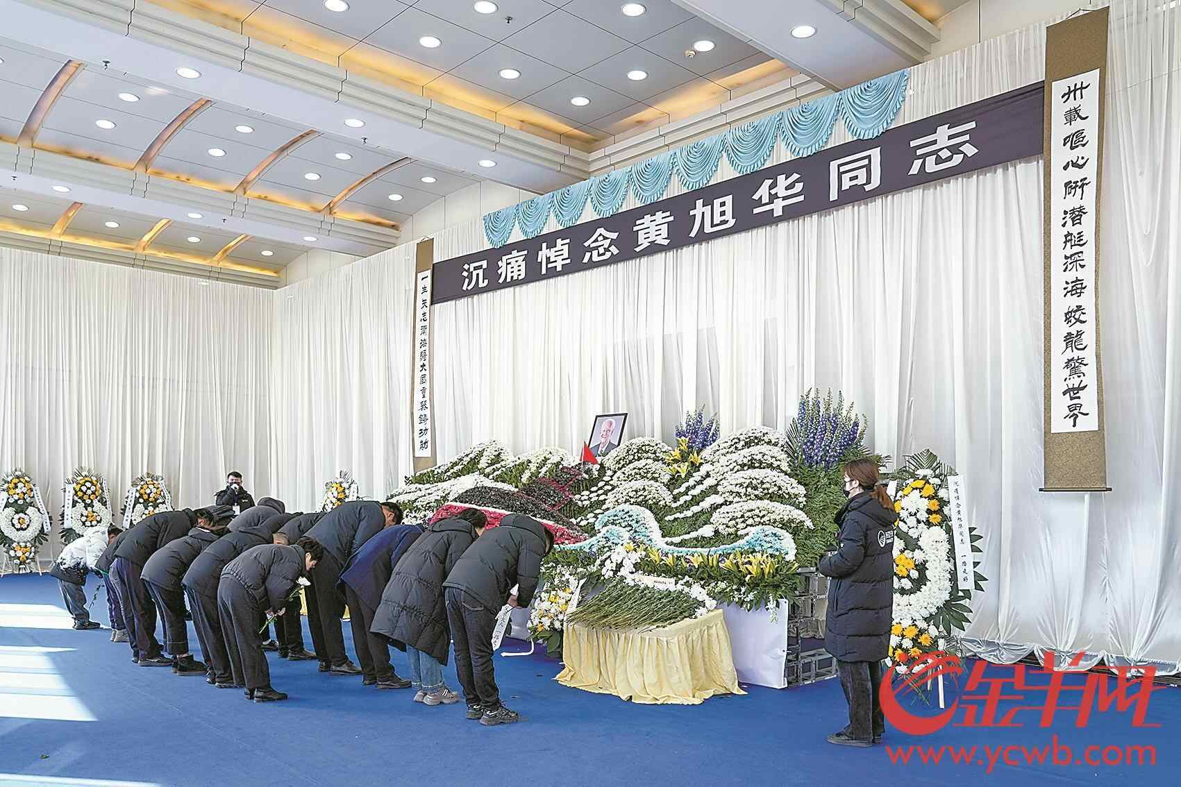 8日,与黄旭华相伴69载的夫人李世英,手持一朵白菊,三鞠躬,泪别黄老。9日上午,40多名广东潮汕亲友,来到武汉吊唁仪式现场,送别致敬。全国各地网友,还纷纷线上下单黄白菊花,将对黄旭华院士的敬意跨越千山万水,传递到仪式现场,其中,撒贝宁敬献花篮挽联,传递哀思。
