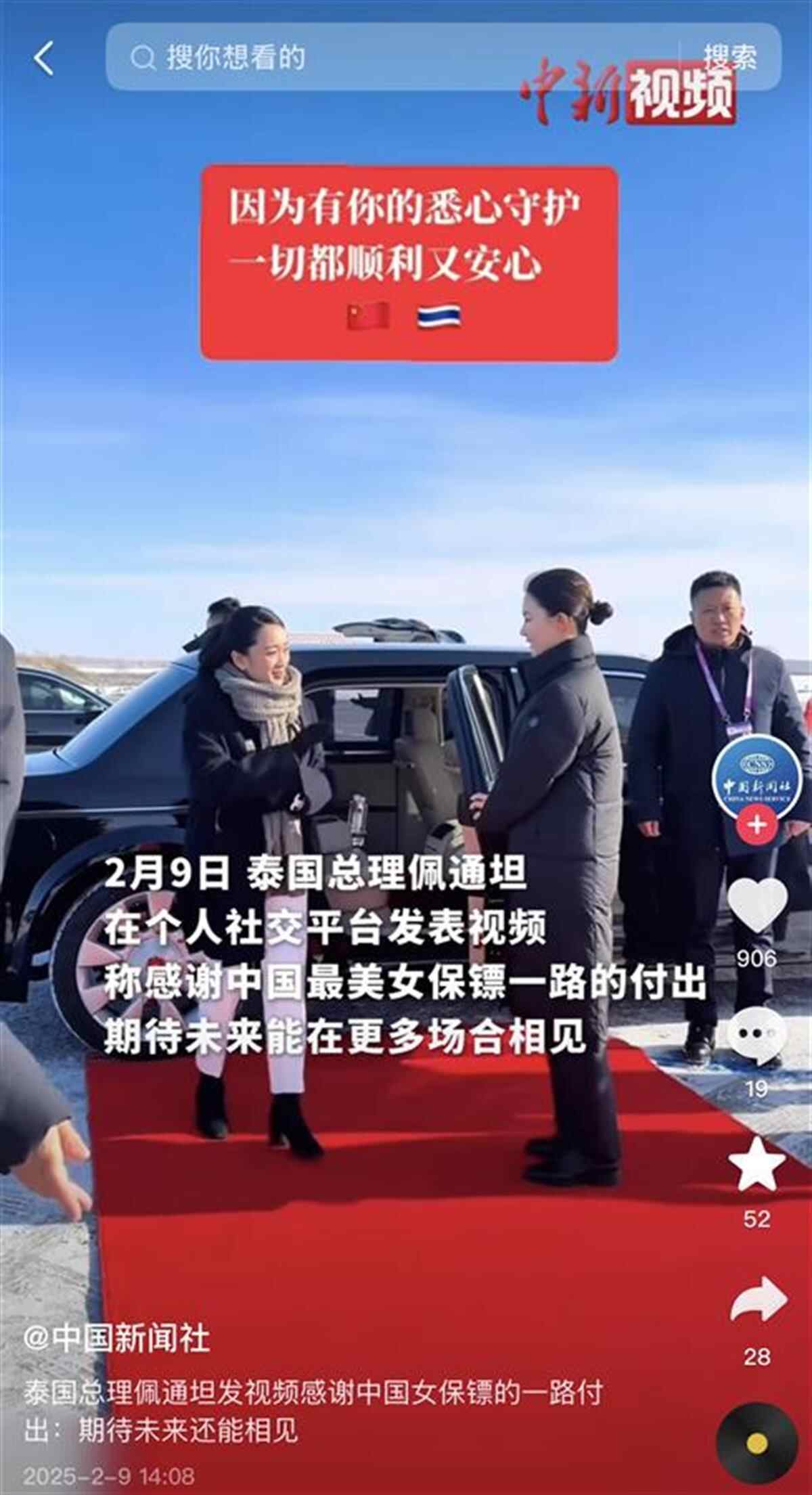 2月9日,泰国总理佩通坦在个人社交平台发表视频,称感谢中国最美女保镖一路的付出,期待未来能在更多场合相见。