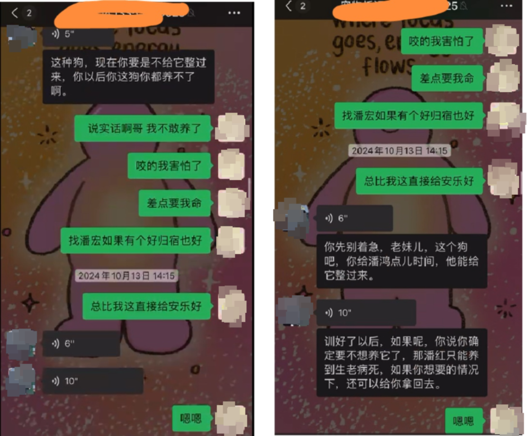 鲍女士称,此后几个月她一直放心不下狗狗,多次询问它的情况,一个网名为“老叔”的工作人员表示,如果她想要狗狗,可以发还给她。“2025年1月中旬,潘宏在训狗过程中出现狗狗死亡。那条名叫艾特的狗也是网红狗,我担心我的狗,想把它要回来。春节前,我跟‘老叔’沟通,他说会把狗狗退还给我。”
