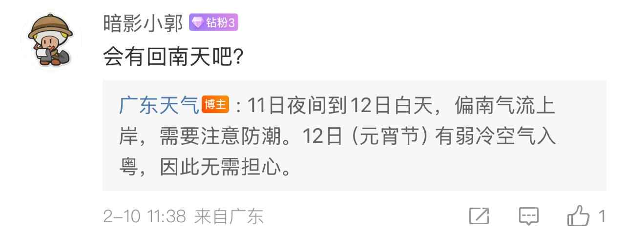 冷空气影响过后气温回升,不少广东居民担忧出现回南天。广东省气象部门2月10日通过新浪微博回复网友表示,预计11日夜间到12日白天,偏南气流上岸,此阶段广东各地需要注意防潮。由于12日夜间起有新一股弱冷空气影响广东,预计广东各地需要防潮的时间相对短暂。但因为偏南气流及弱冷空气南下时段广东天气将有所转变,建议有晾晒需求的公众抓紧当下的“广东蓝”天况晾晒衣物,并根据天气变化适时将晾晒衣物的地点由户外转移回室内。