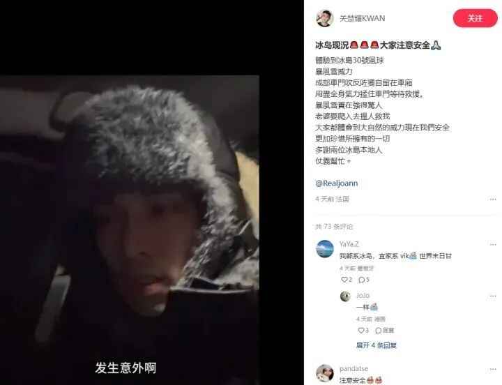 近日,香港演员关楚耀自曝与太太在冰岛自驾游期间,遭遇30号风球暴风雪。