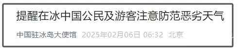 2月6日,中国驻冰岛大使馆曾发文提醒中国公民及游客注意防范恶劣天气。