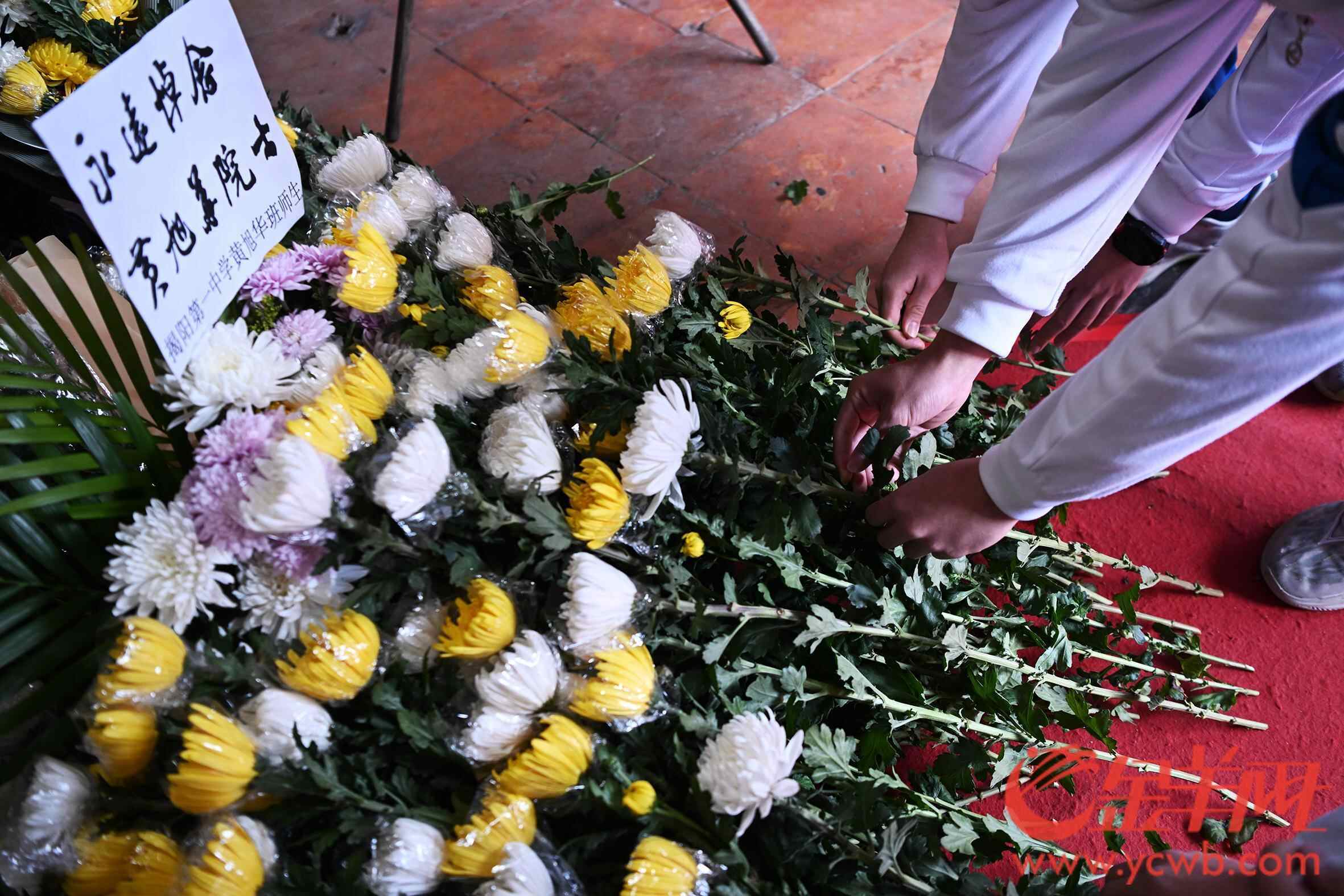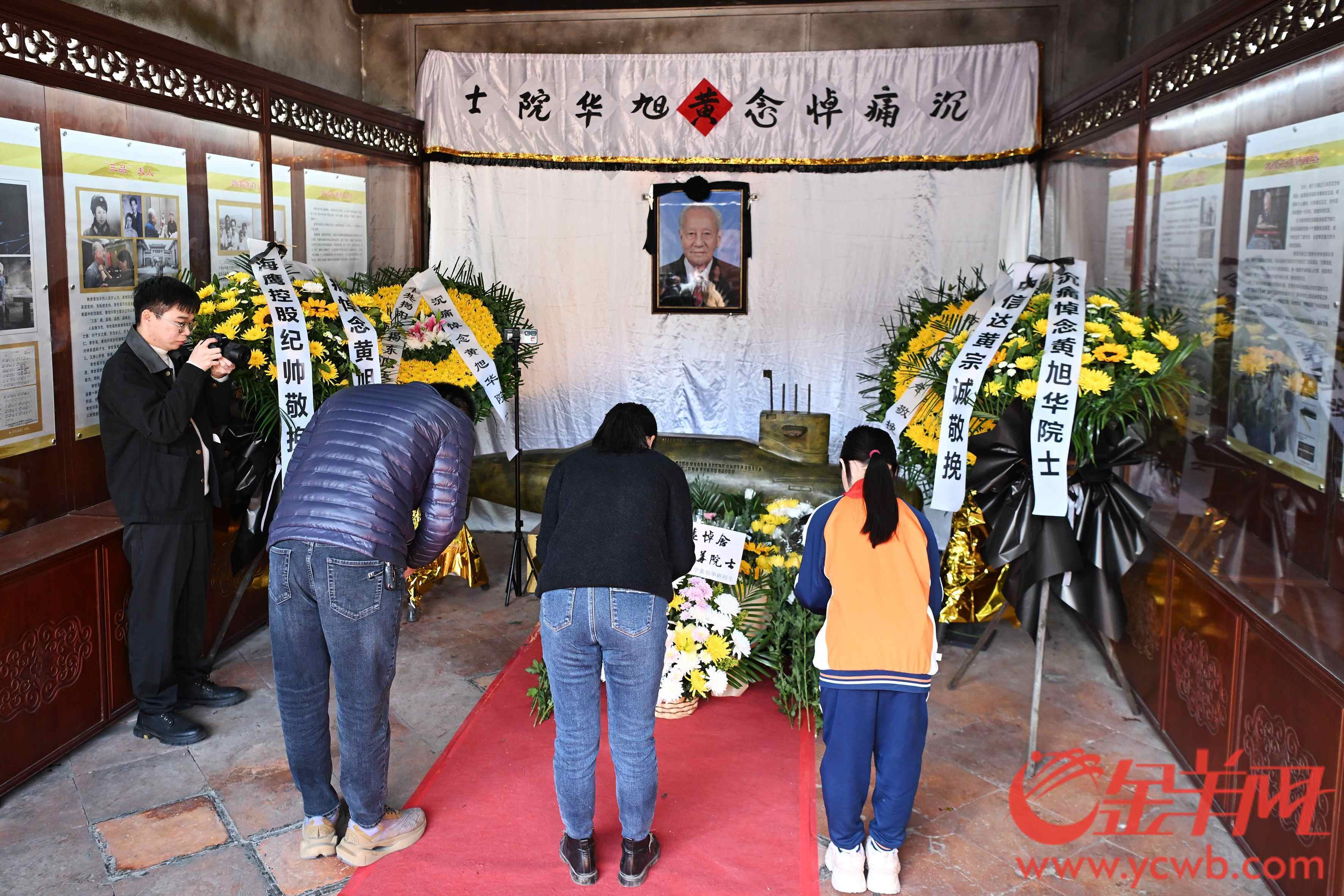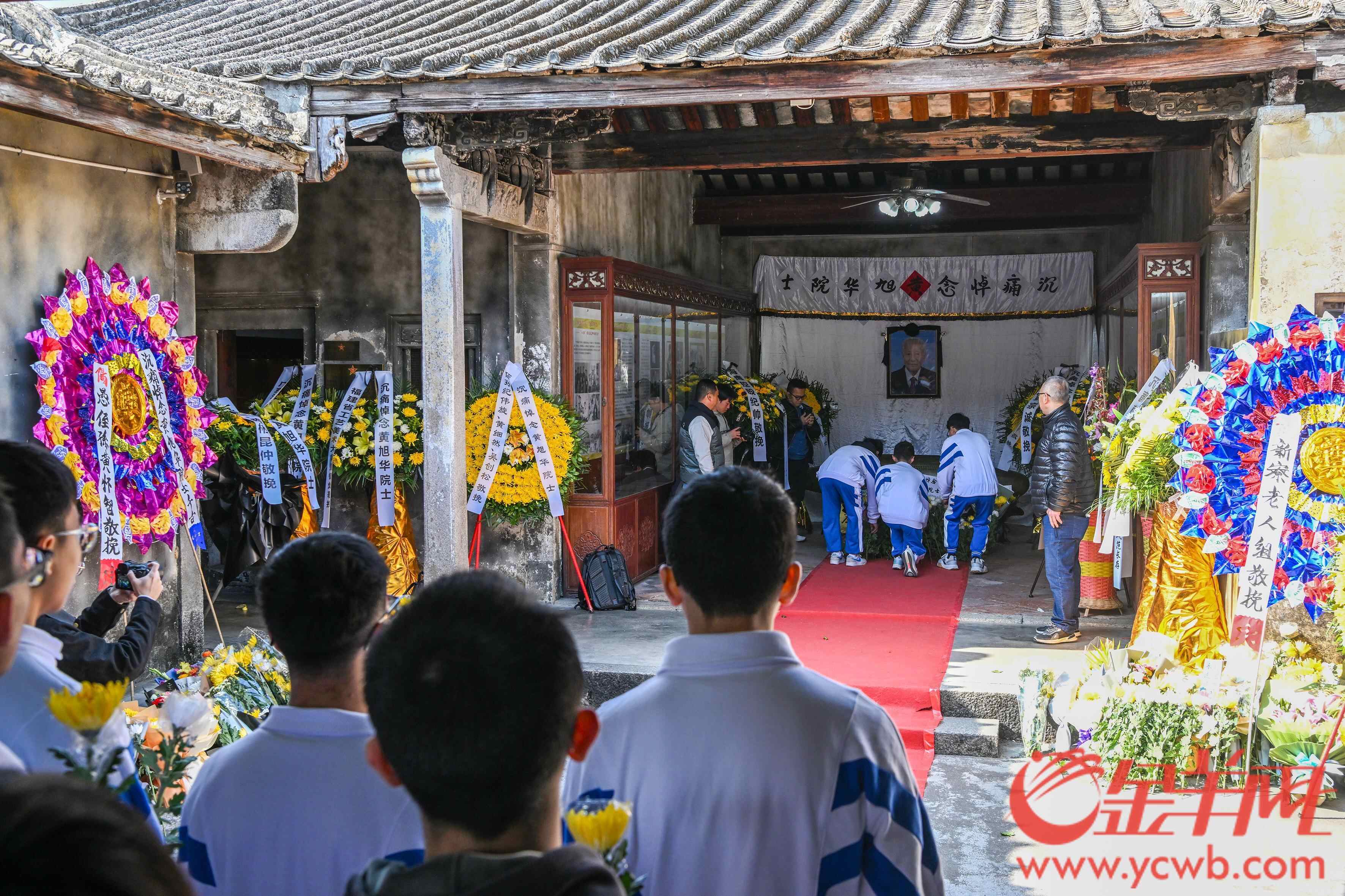 上午九时许,黄旭华故居前就排起了数百米的队伍,来自揭阳一中黄旭华班、玉湖中学以及新寮小学的学生和前来吊唁的市民群众庄严肃穆,怀着悲痛的心情敬献黄白菊花,表达深切缅怀和崇高敬意。