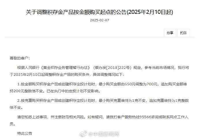 此外,中国银行宣布将于2月10日起调整积存金产品购买条件。按金额购买积存金产品或创建积存定投计划时,最小购买金额由650元调整为700元。