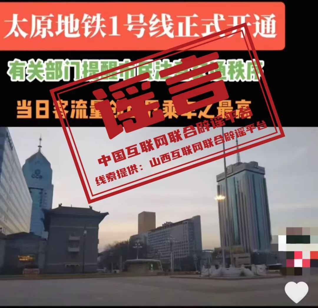 真相:近日,有网民发布短视频称“太原地铁1号线正式开通,有关部门提醒市民注意交通秩序,当日客流量创世界乘车之最高”。经与当地交通部门核实,此信息内容不实。该网民行为违反《网络信息内容生态治理规定》第六条第八款规定,网信部门已将线索移交公安部门进一步调查处理。(来源:“山西网络举报”微信公众号)