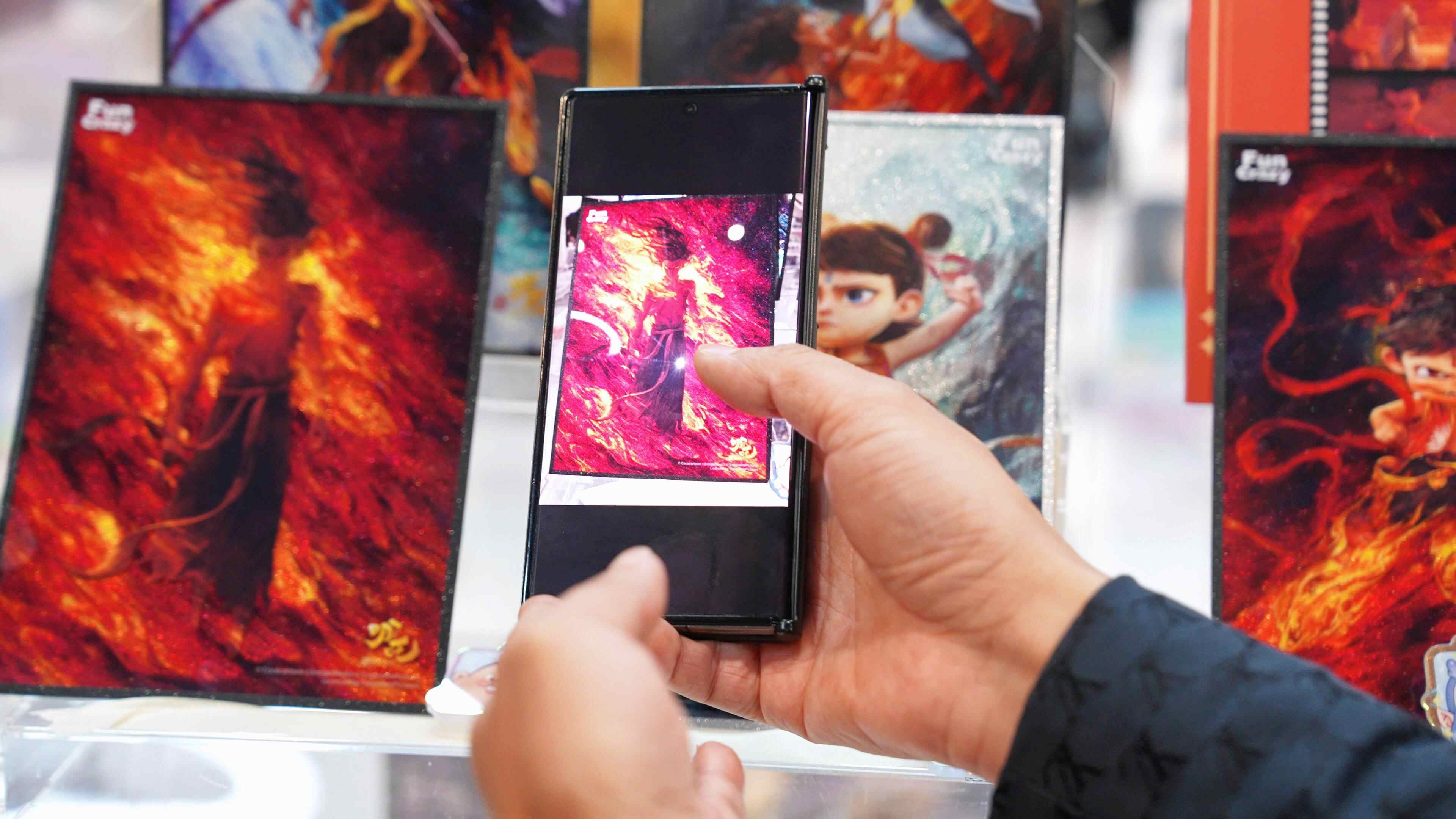 作为FunCrazy《哪吒2》系列周边的独家生产商,衡立泰生产的哪吒系列“谷子”包括方形、圆形亚克力徽章(吧唧)、夹子徽章、色纸、亚克力挂件、剧情胶片卡等,其中卖得最火爆有反光徽章、反光色卡。据陈祺介绍,产品采用闪底技术,用闪光灯拍摄即可显现出闪光的视觉效果,复刻出电影中哪吒火焰燃烧的画面。在社交平台上搜索“哪吒反光徽章”,可见众多粉丝晒出周边,直呼“绝美”“帅炸了”“上等周边好物”……
