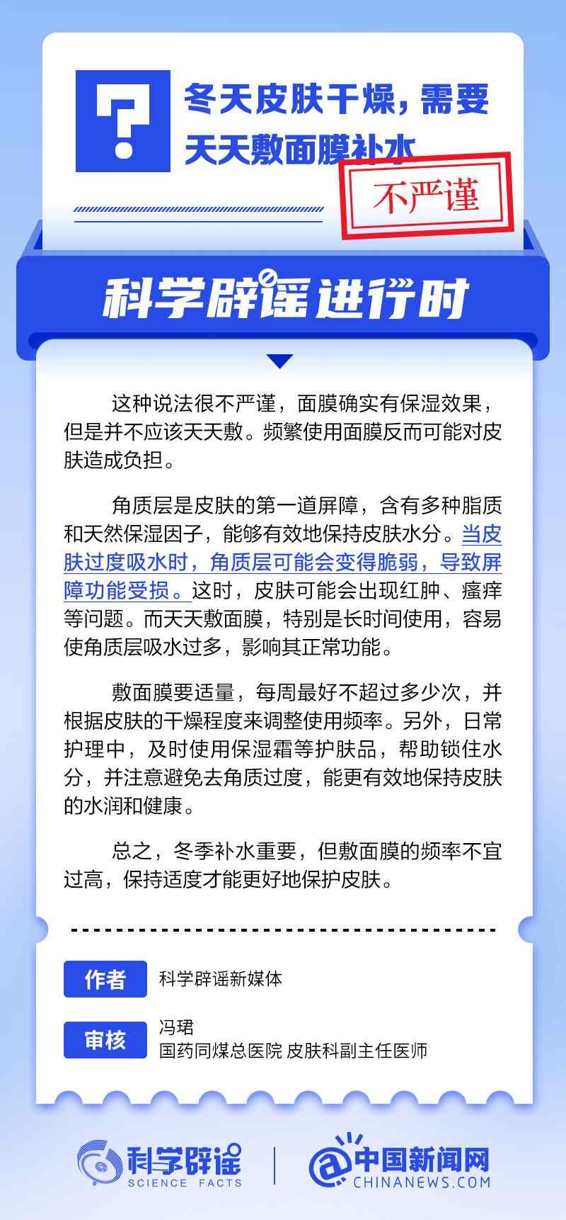 中新网2月11日电 冬天皮肤干燥,需要天天敷面膜补水?面膜确实有保湿效果,但是并不应该天天敷。频繁使用面膜反而可能对皮肤造成负担。角质层是皮肤的第一道屏障,含有多种脂质和天然保湿因子,能够有效地保持皮肤水分。当皮肤过度吸水时,角质层可能会变得脆弱,导致屏障功能受损。(来源:@科学辟谣 中国新闻网微博)