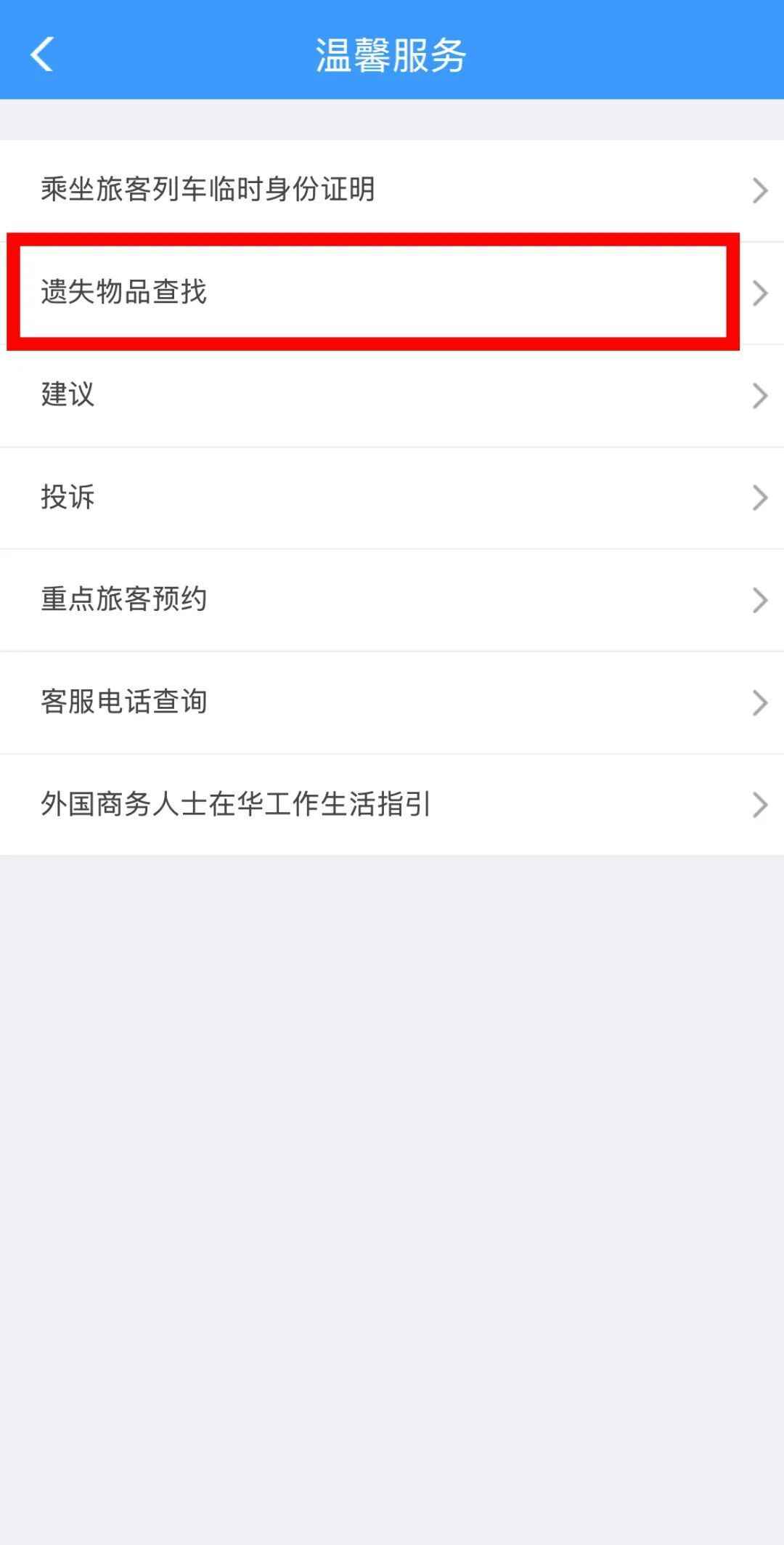 如果您在乘车途中不慎遗失了自己的行李物品,可以使用12306App的温馨服务功能,查找您的遗失物品。