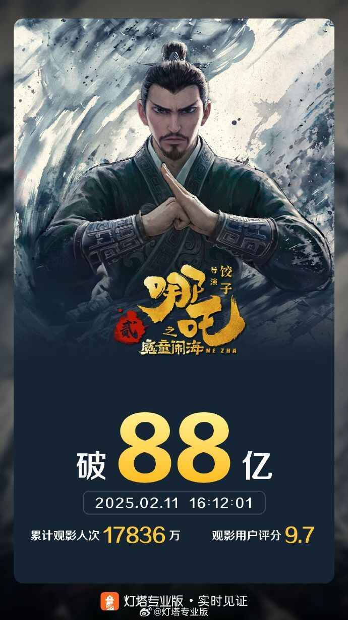 据灯塔专业版实时数据,截至2月11日16时12分,影片《哪吒之魔童闹海》票房突破88亿。