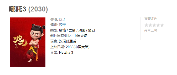 春节以来,《哪吒2》电影的热度居高不下。有细心的网友发现,几天前哪吒3豆瓣页面的上映时间还是2028年,2月11日,上映时间已经改为2030年。有网友猜测,可能是饺子偷偷改了计划上映时间。