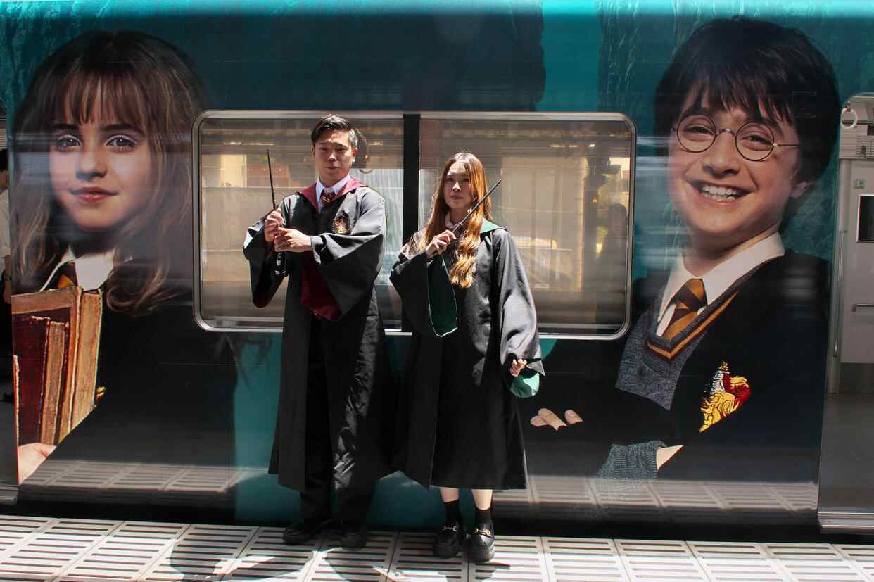 当地时间2023年6月16日,日本东京,粉丝们穿着戏服与印有哈利波特海报的列车合影。
