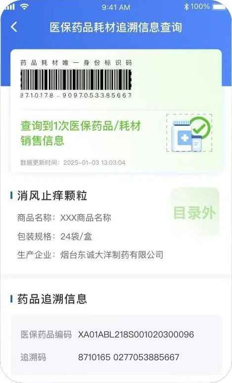 界面如提示“查询到1次药品/耗材销售信息”并显示该追溯码对应的药品通用名、商品名、规格、生产企业、数据更新时间等信息,此情况说明药品来源属于正常合法渠道,患者可以放心使用。