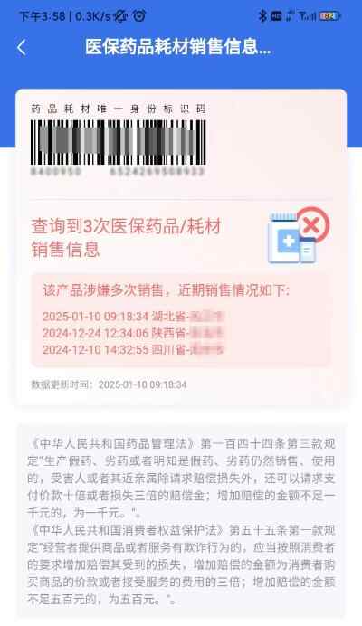 界面如提示“查询到多次医保药品/耗材销售信息”并显示出最近几次的销售记录,该情况说明被查询产品涉嫌多次销售,群众可依据此信息按照《中华人民共和国药品管理法》、《中华人民共和国消费者权益保护法》相关条款要求,向销售此药品的定点医药机构索赔。