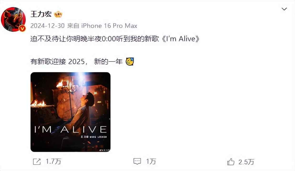 2024年12月30日,王力宏发布新歌,《I'm Alive》,称用新歌迎接 2025,迎接新的一年。