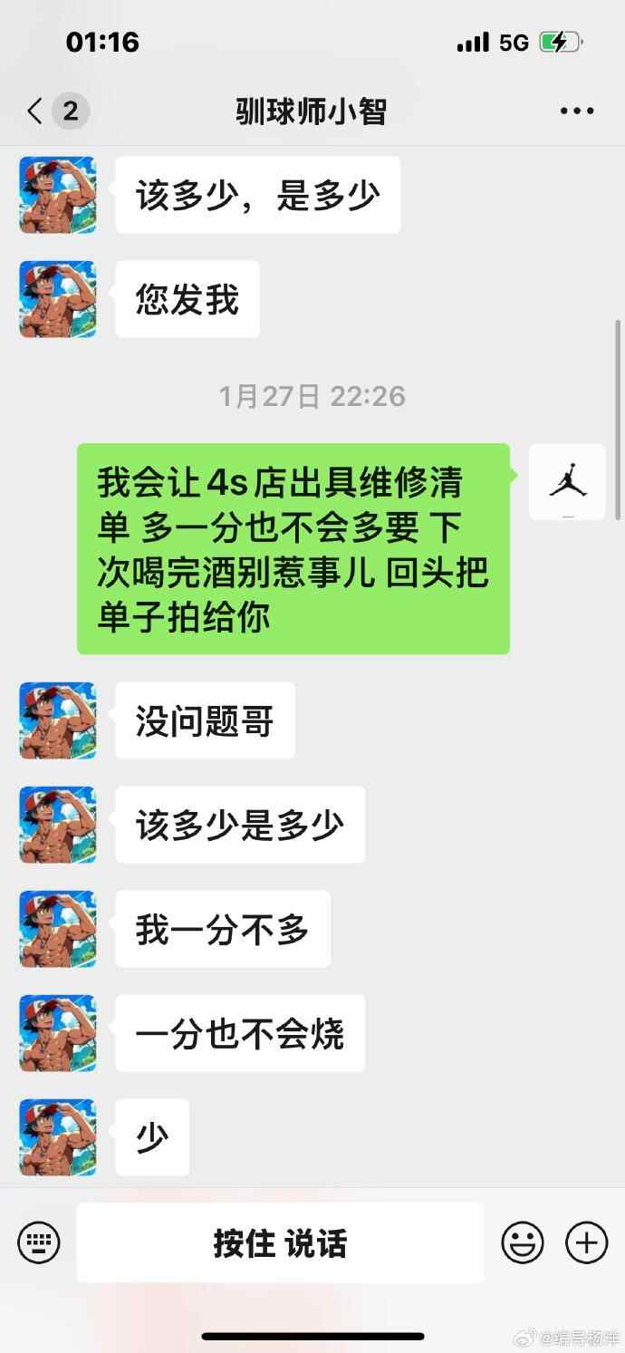 次日,当事人将汽车的维修清单发给李明德,对方的态度却发生了180度转变。他先是提出给一个月时间凑钱换车,在爆料人表示只需修好车的情况下,李明德拒绝赔偿,并要求当事人与其经纪人对接,随后拉黑了当事人微信。