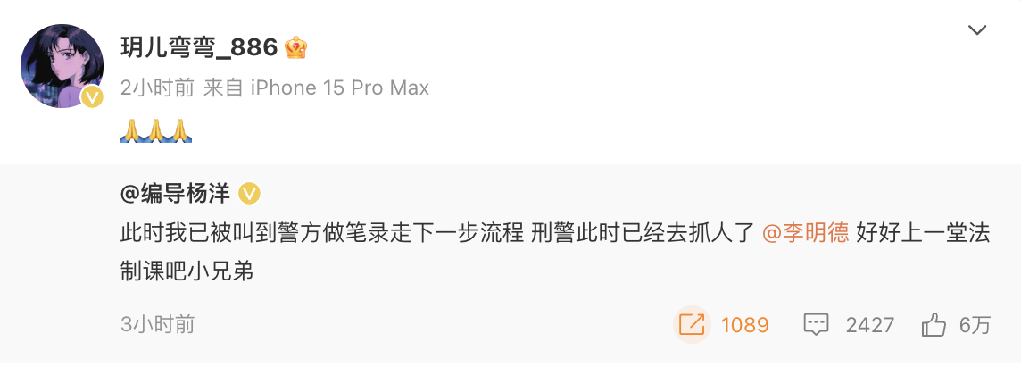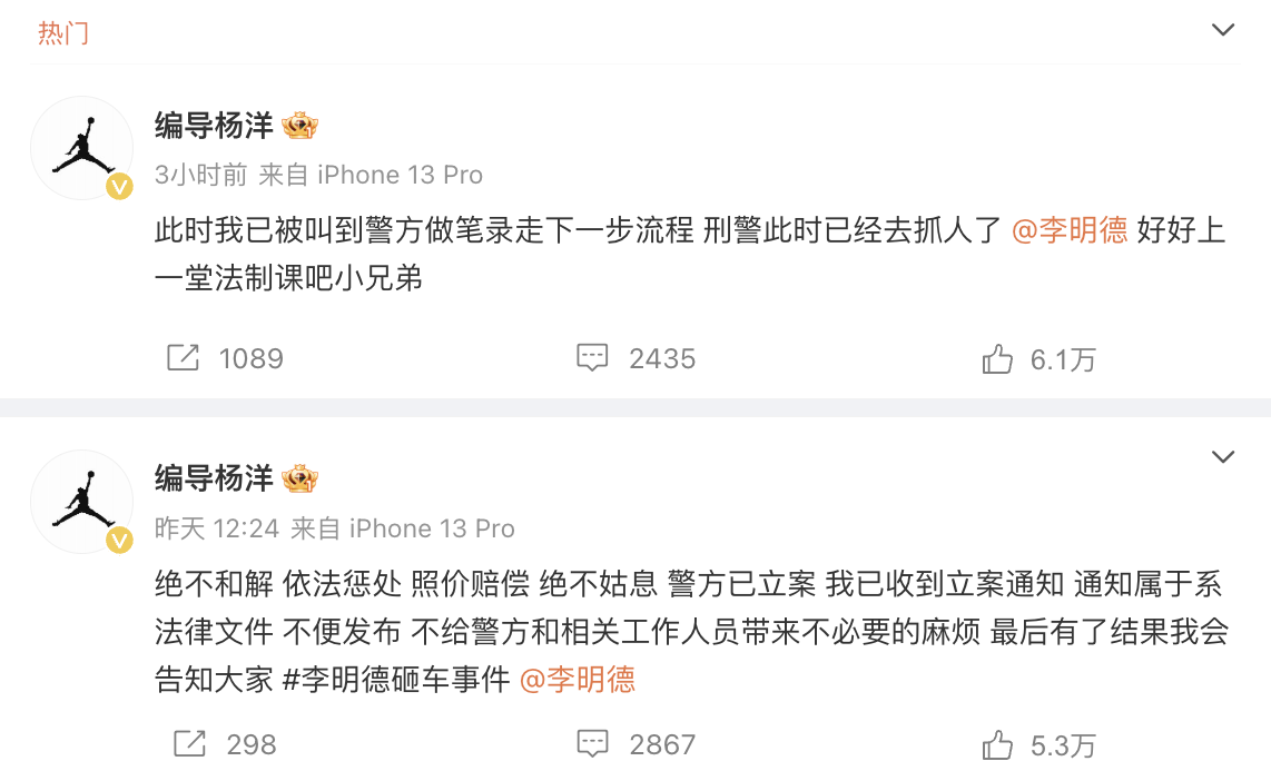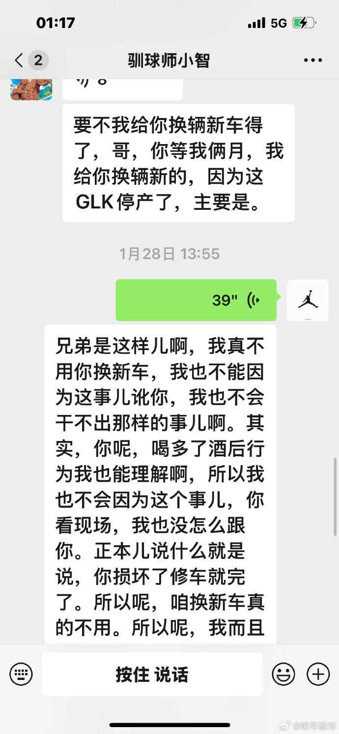 2月11日凌晨,有网友晒出多张聊天记录截图,称李明德醉酒后砸坏他的车,并拒绝赔偿,警方已介入调查。