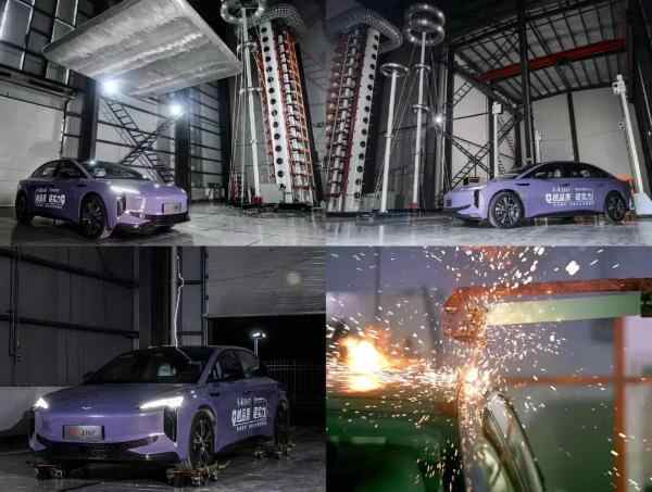 雷击试验模拟了雷雨天气时会遇到的四大场景:脉冲电场试验和脉冲磁场试验模拟雷电击打到车辆附近,产生的电场和磁场对车辆的影响;初始先导附着试验模拟雷电击打到车身,高电压对车辆造成的直接影响;大电流物理破坏试验则是模拟雷电击打到车身,大电流对车辆造成的直接影响。试验结束后,车辆及动力电池无起火、无爆炸现象,车辆能正常行驶。