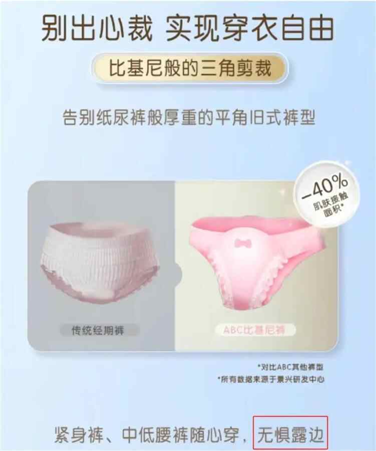 2月6日,ABC发布一款名为“比基尼安睡裤”的卫生巾新品引发热议。有网友认为,该产品为“经期性感”牺牲舒适度,比基尼式还有偷工减料的嫌疑,并对其进行抵制。