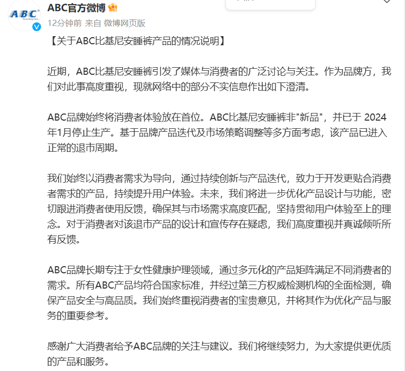 ABC品牌始终将消费者体验放在首位。ABC比基尼安睡裤非“新品”,并已于2024年1月停止生产。基于品牌产品迭代及市场策略调整等多方面考虑,该产品已进入正常的退市周期。
