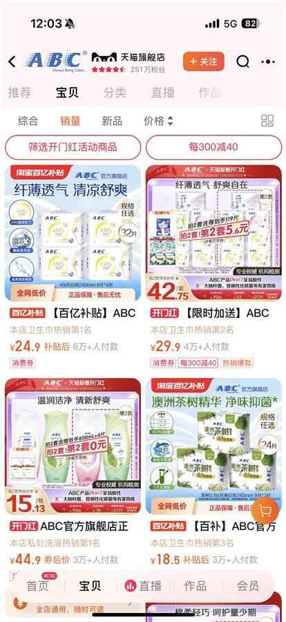 记者注意到,目前在ABC品牌天猫旗舰店中,“比基尼经期裤”已下架,目前在售的裤型系列商品包括“轻羽无忧裤”“安睡曲线裤”“无忧裤”等。