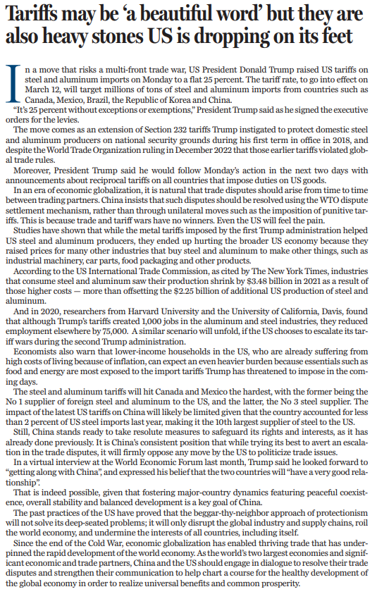 贸易保护砸自己的脚。(来源:中国日报 罗杰 英文《中国日报》2025年2月12日8版)