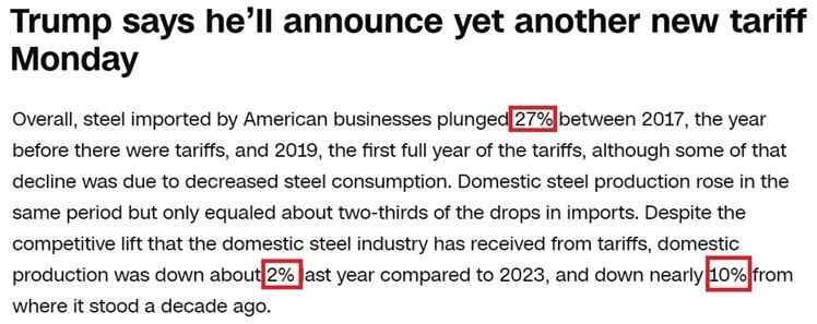 美国有线电视新闻网:美国企业进口的钢铁在特朗普首届政府加征关税的前一年(2017年)至加征关税的第一个完整年(2019年)期间下降了27%,虽然同期美国国内钢铁产量有所增长,但仅相当于进口降幅的三分之二左右。与2023年相比,去年美国钢铁产量下降了约2%,与十年前相比下降了近10%。