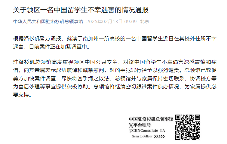 驻洛杉矶总领馆高度重视领区中国公民安全,对该中国留学生不幸遇害深感震惊和痛惜,向其亲属表示深切哀悼和诚挚慰问,对凶手犯罪行径予以强烈谴责。总领馆已敦促美方加快案件调查,尽快将凶手绳之以法。总领馆并与家属保持密切联系,协调校方等为善后处理等事宜提供积极协助。总领馆将继续密切跟进案件侦办情况,为家属提供必要支持。