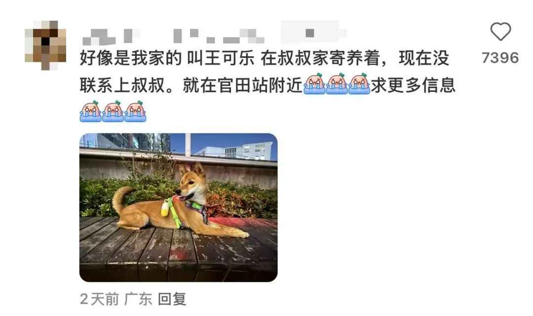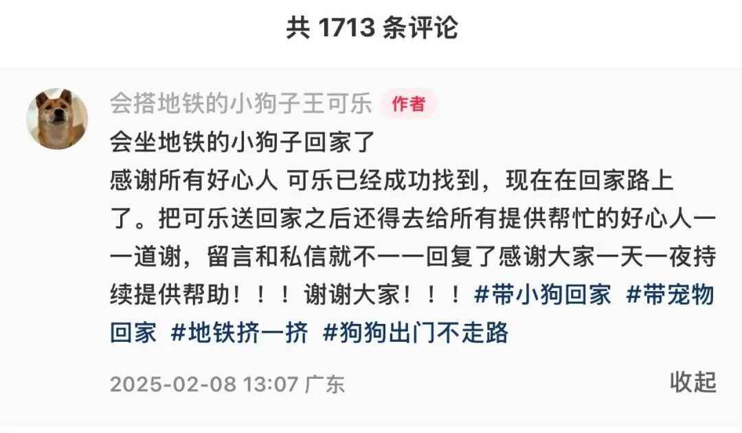 2月7日中午12时许,其主人刷到帖子,发现这只地铁中的狗狗极像春节期间寄养在叔叔家的宠物“王可乐”,确认狗狗是自己丢失的后,宋先生立即在视频下方留言提供信息,并请求网友帮忙寻狗。