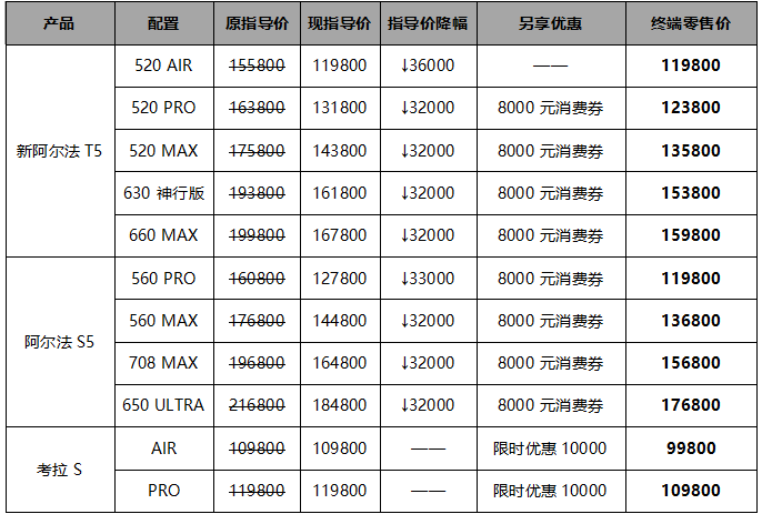 即日起,极狐对新阿尔法T5和阿尔法S5官方指导价进行下调,官方降价32000元,还可另享8000元消费券,如此一来,5系“双子星”终端零售价最低仅需11.98万元;考拉S限时优惠增至10000元,终端零售价直接下探到了9.98万元起。