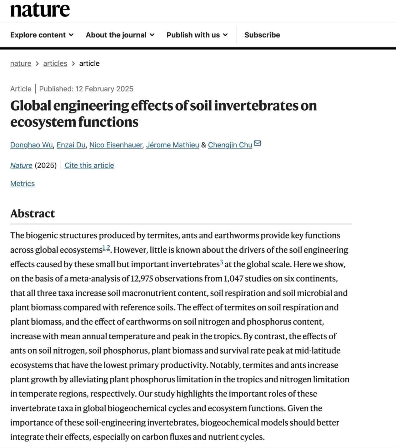 2月12日,中山大学生态学院储诚进教授团队在《自然》(Nature)杂志发表论文,研究显示,白蚁、蚂蚁和蚯蚓等土壤无脊椎动物具有提升土壤肥力、改善土壤质地和促进作物产量的生态系统功能,对促进全球元素循环、物质降解和生物多样性维持具有重要作用。这一研究为应对气候变暖和促进生态修复提供了全新思路。
