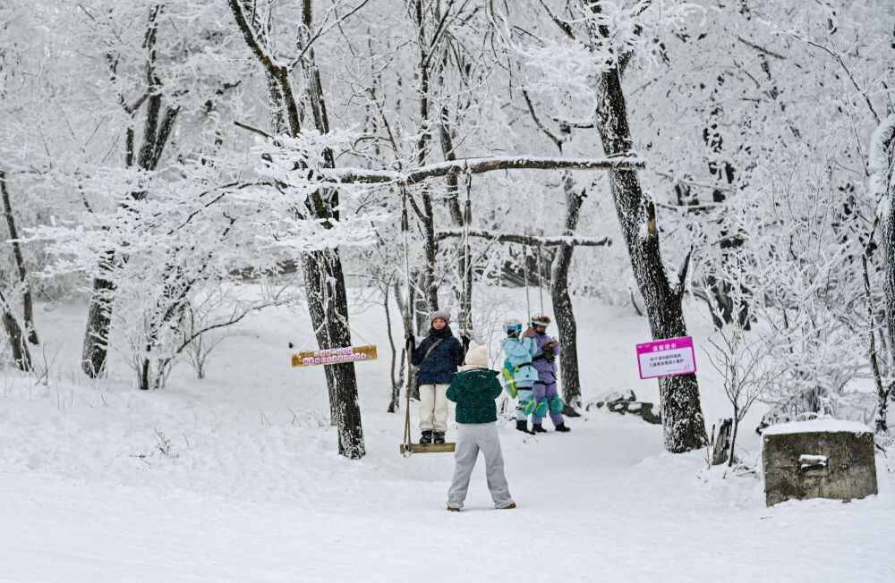 长春净月潭国家森林公园有天然的林海赛道、挂满雾凇的树木和独具中华文化特色的冰雕雪塑、卡通人偶。