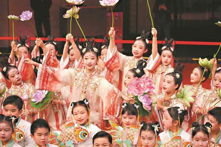 开幕展演上,“望川打击乐团”的《擂鼓迎春》以鼓声敲响了广府庙会的序曲。情景表演《福降羊城》从宋代《太平广记》中汲取灵感,呈现了广府文化特色符号——羊城使者。舞台上,广府文化推广大使张弛扮演羊城使者,以粤语诵读带领观众共赏元宵佳会。