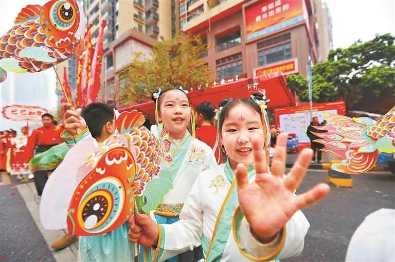 巡游中,十八大方阵各展风采。八音锣鼓老艺人奏响了千年古韵,少儿武术队英姿飒爽;北帝銮驾护卫队庄严威武,孩童手提鱼灯;“小龙狮传承方阵”50名少年以坚定的步伐舞动非遗之光。“好家风方阵”中,祖孙三代身着汉服,展现了孝亲睦邻的文明新风。