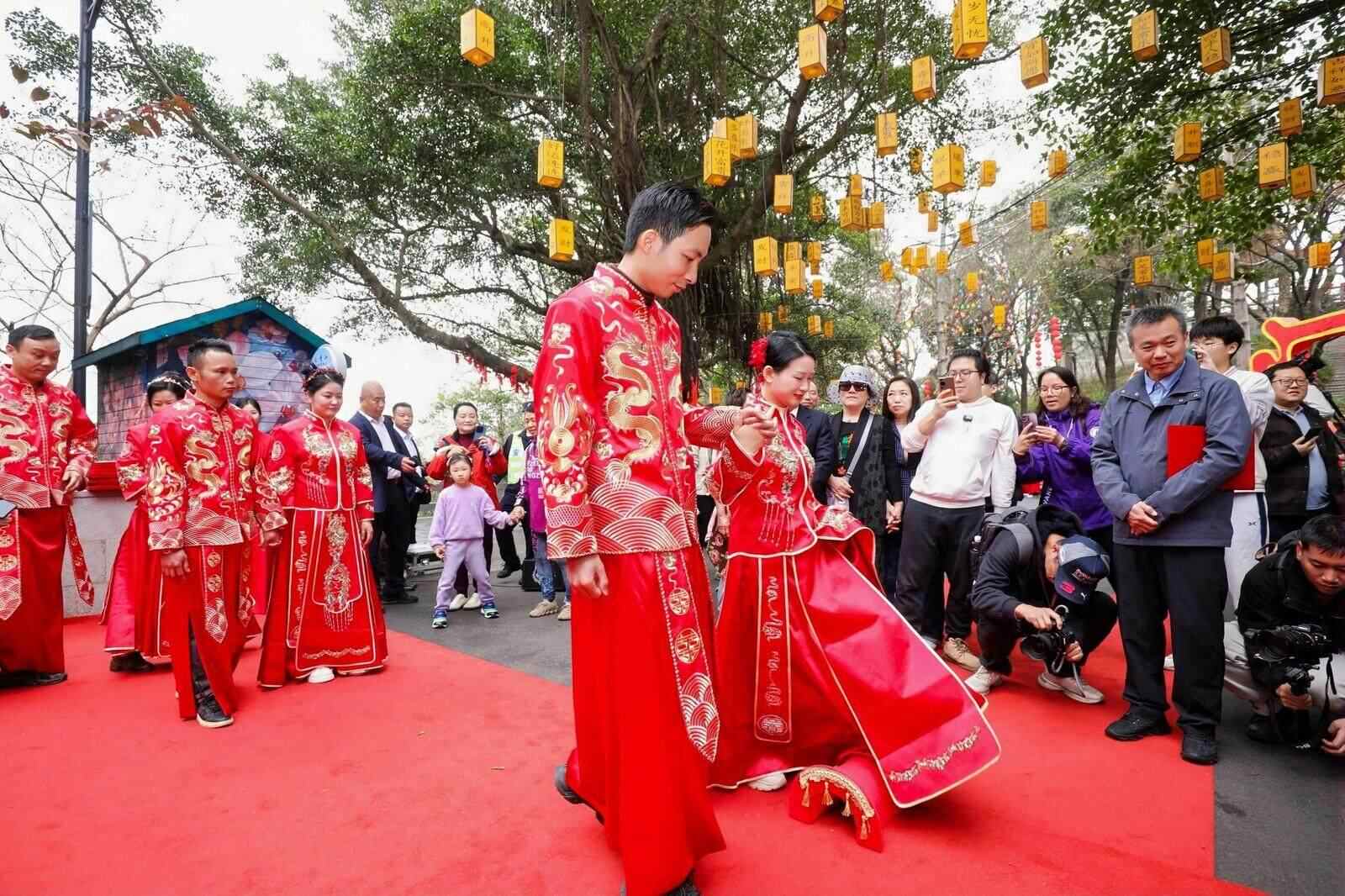 2月12日,白云山摩星岭景区管理中心与白云区民政局共同举办的“幸福白云·缘定摩星”——白云区户外颁证仪式暨元宵节集体婚礼活动顺利举行,九对新人在云山珠水的见证之下喜结连理,更有国际友人体验中式婚礼独特魅力。此次活动不仅促进了“甜蜜经济”的发展,也充分展示了中华优秀传统文化的深厚底蕴。