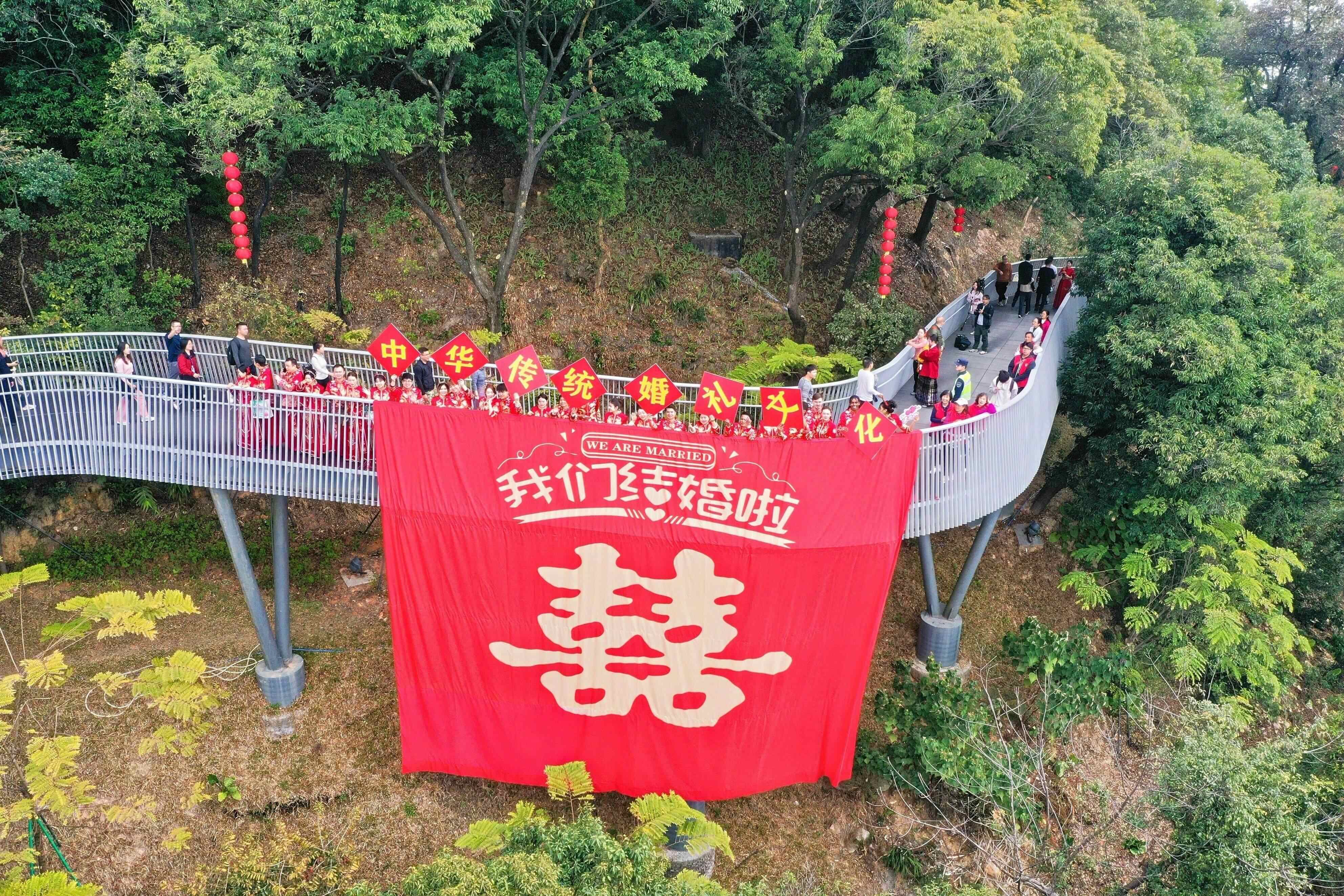 跨马鞍、对拜天地、喝交杯酒、庄严宣誓……元宵佳节,春意融融,白云山摩星岭化身浪漫婚礼殿堂:一对对身着中式龙凤褂的新人在栈道之上携手欢笑,红底金字的双喜旗在蓝天白云间迎风飘扬,航拍镜头精准捕捉到这幅喜气洋洋的温馨图景。